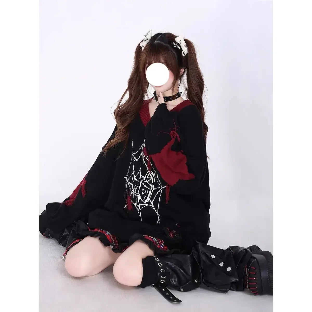 Embrace dark allure with this Black and Red Oversized Grunge Spider Sweater. Featuring bold spider motifs and deep, haunting hues, its relaxed fit drapes effortlessly, combining edgy style with comfort. Perfect for casting a shadowy presence, this sweater adds a gothic edge to any wardrobe.