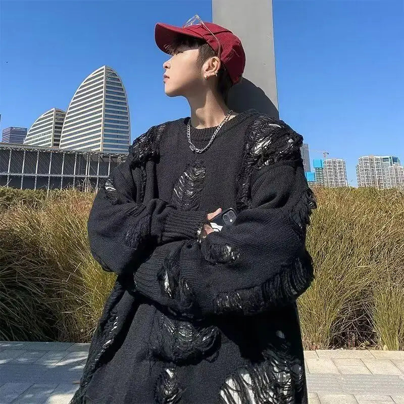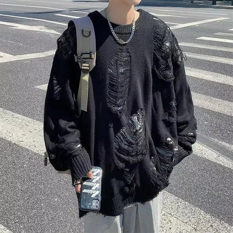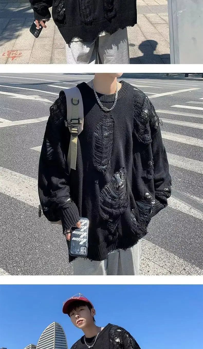 Distressed wool sweater that channels raw, unpolished edge. The black and grey colorway delivers moody aesthetic appeal, while the intentionally ragged construction defines authentic grunge style. Crafted from genuine wool for warmth and texture, this piece embraces imperfection as its greatest strength. Perfect for those who reject polish in favor of gritty authenticity. Layer it over vintage tees or wear solo for effortless anti-fashion credibility.