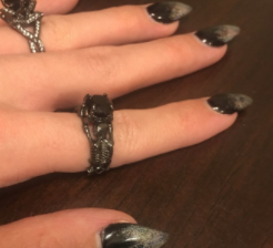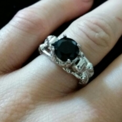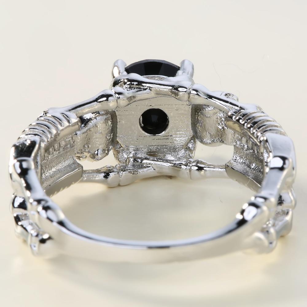 Beautiful silver tone ring, two skeletons carry this black cubic zircon stone. Fine Details. Gorgeously Gothic glamour.
