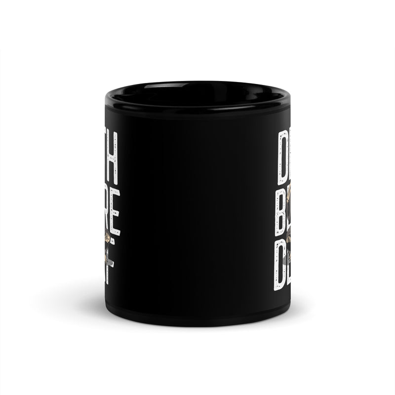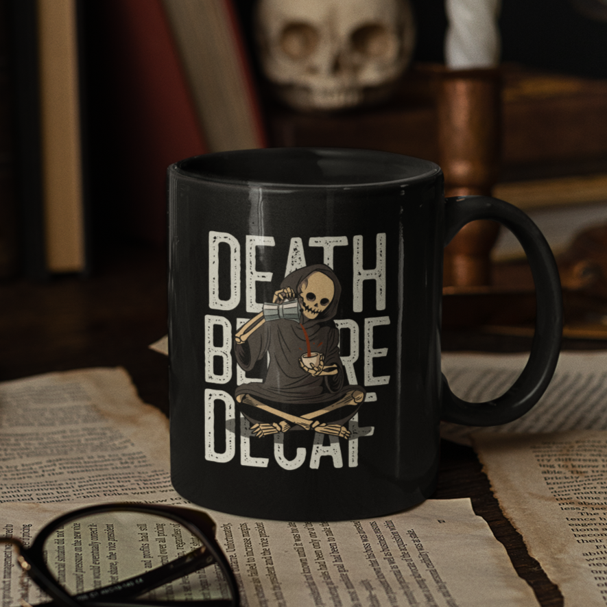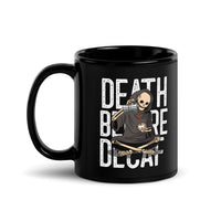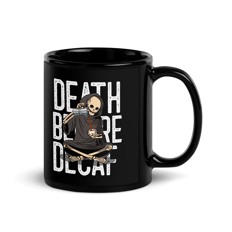 This glossy black 'Death Before Decaf' mug is perfect for your favorite morning drink. With an 11oz (325ml) capacity, this mug can hold your daily coffee or tea, and its unique design featuring a happy little reaper will make your morning ritual even more enjoyable.