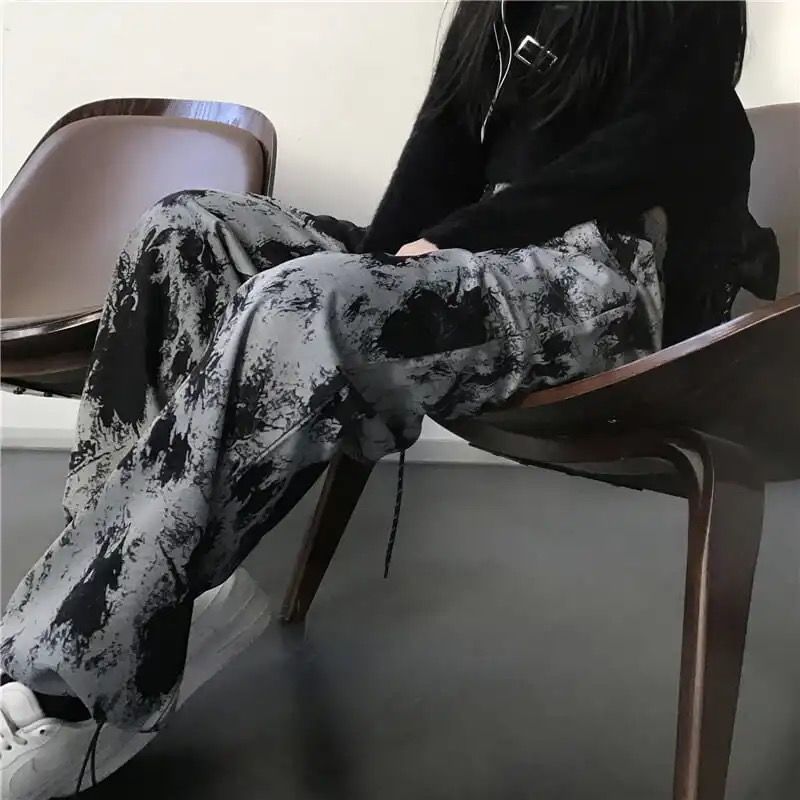 Black and Grey baggy pants with tie waist, comfy pants for lounging or outdoors. Featuring a tie dye pattern.