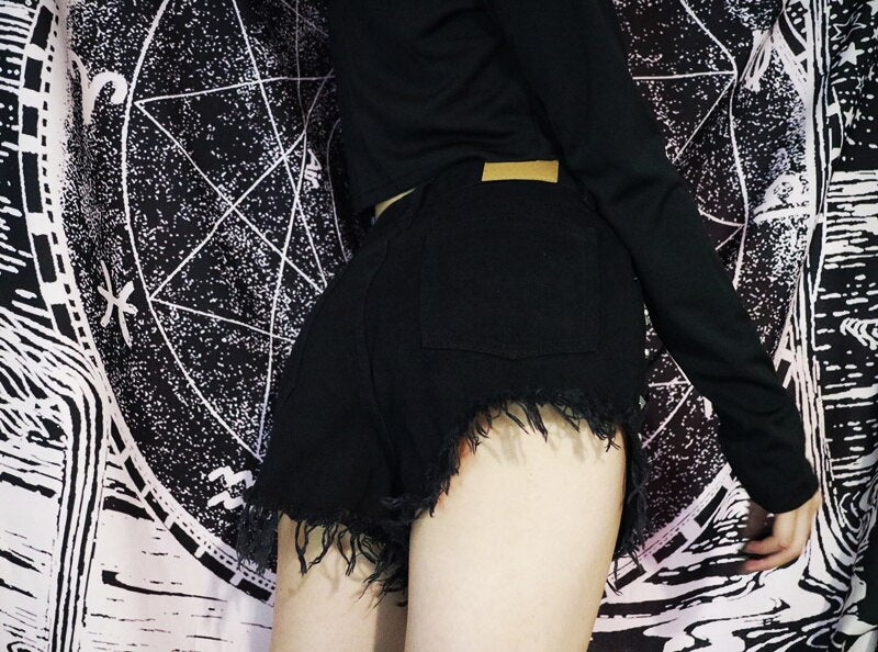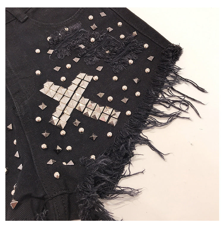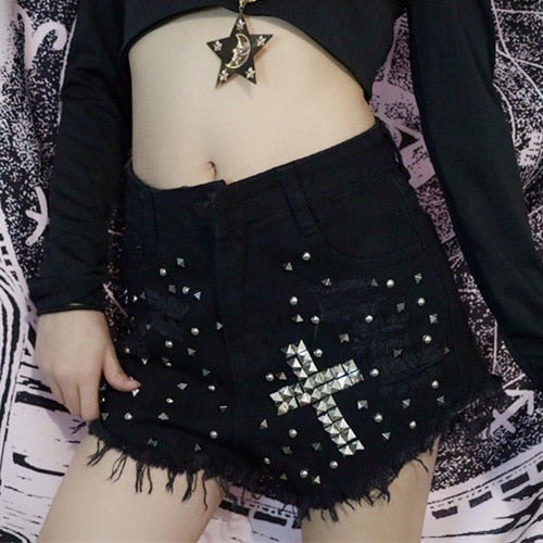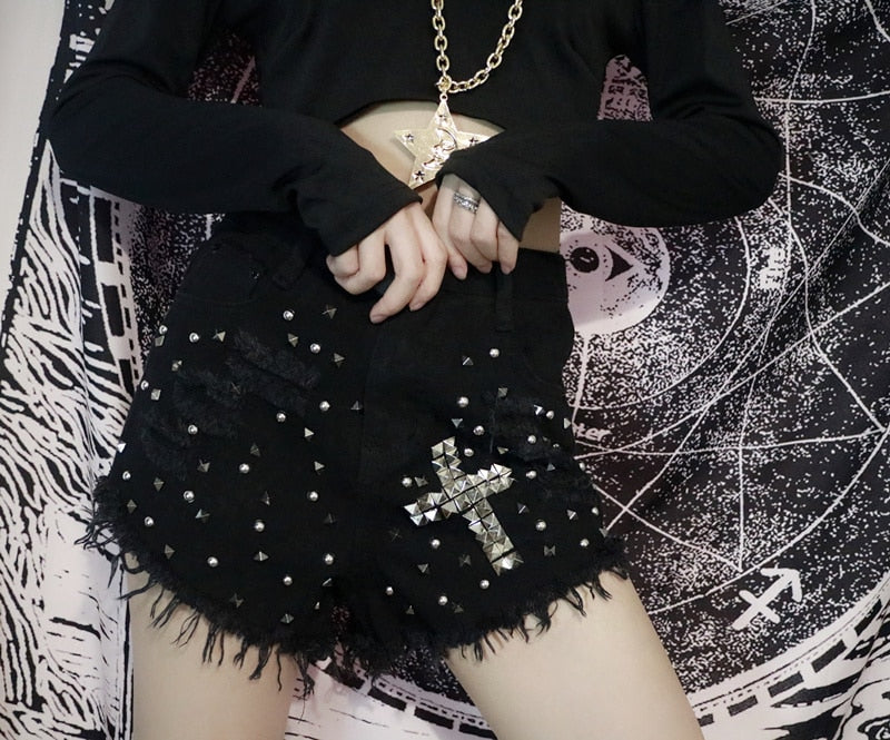 'Danger' Black/ Blue Goth Alt Studded Cross Shorts