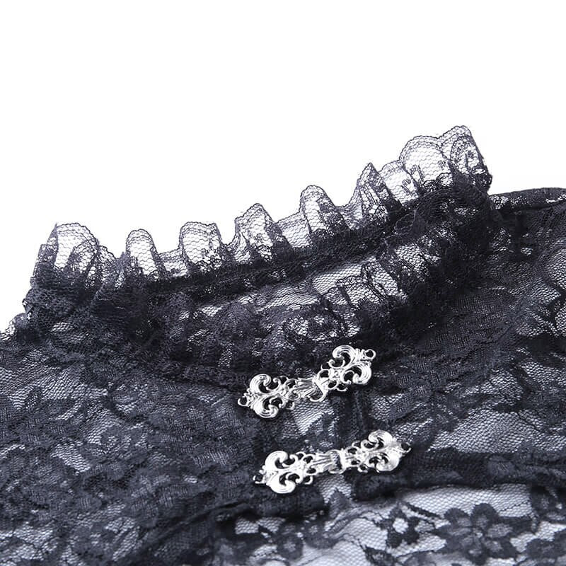 Embrace the darkness with the 'Departed' Black Gothic Lace bolero. Made from intricate lace and adorned with a scalloped hem, this bolero adds a touch of mystery and seduction to any outfit. Perfect for completing your gothic look, show off your elegant yet edgy style with this bold statement piece.