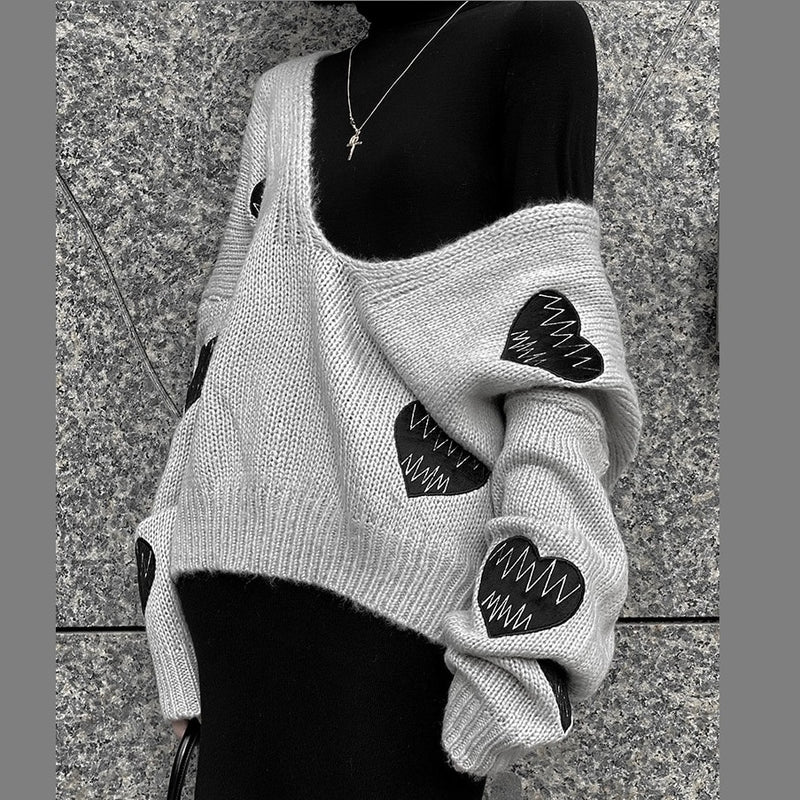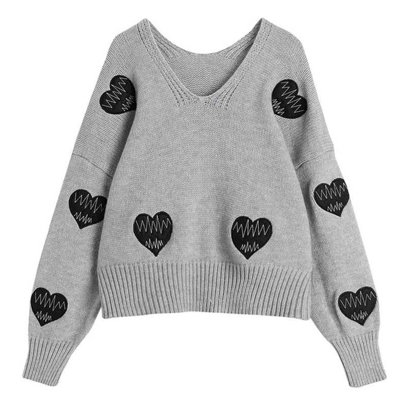 'Heart Attack' Grey Grunge Love Embroidery Sweater